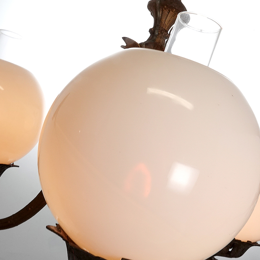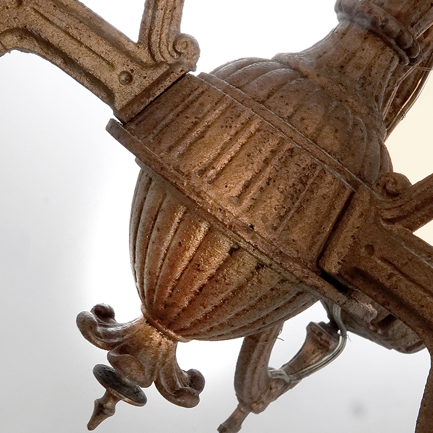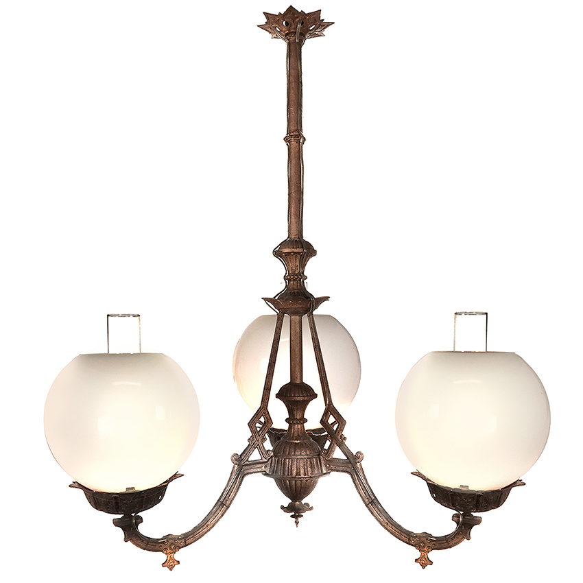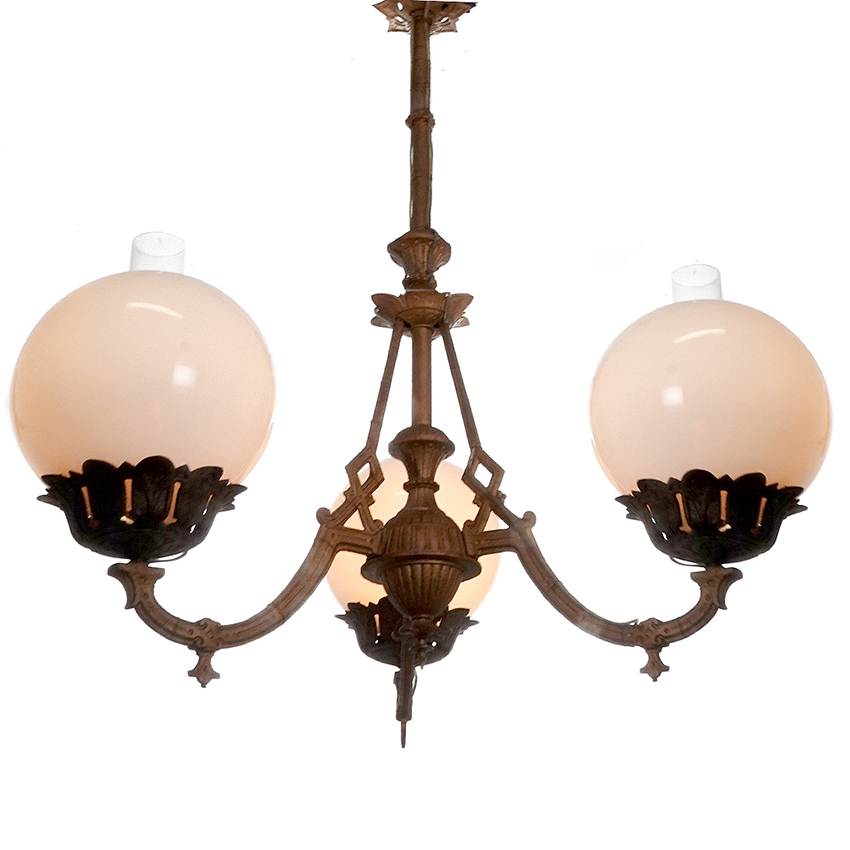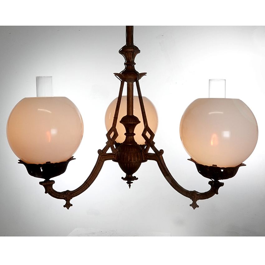 This 3 arm chandelier is all cast iron in the original aged paint. It has been wired to take 3E26 40W bulbs or brighter LESs. Each arm features an oversize 9 inch diameter vaseline glass globe and clear glass chimney in place of the oil fonts. It gives off a nice warm glow and has a whole new look for a classic oil chandelier…. 32″ diameter x 36″… $3200
