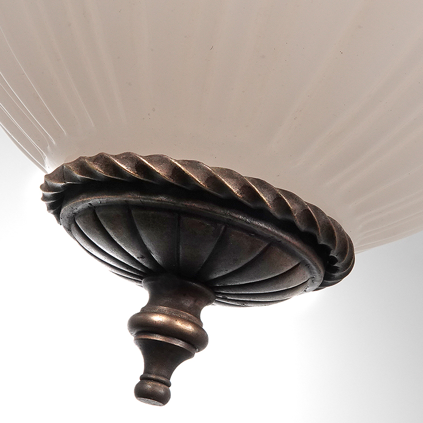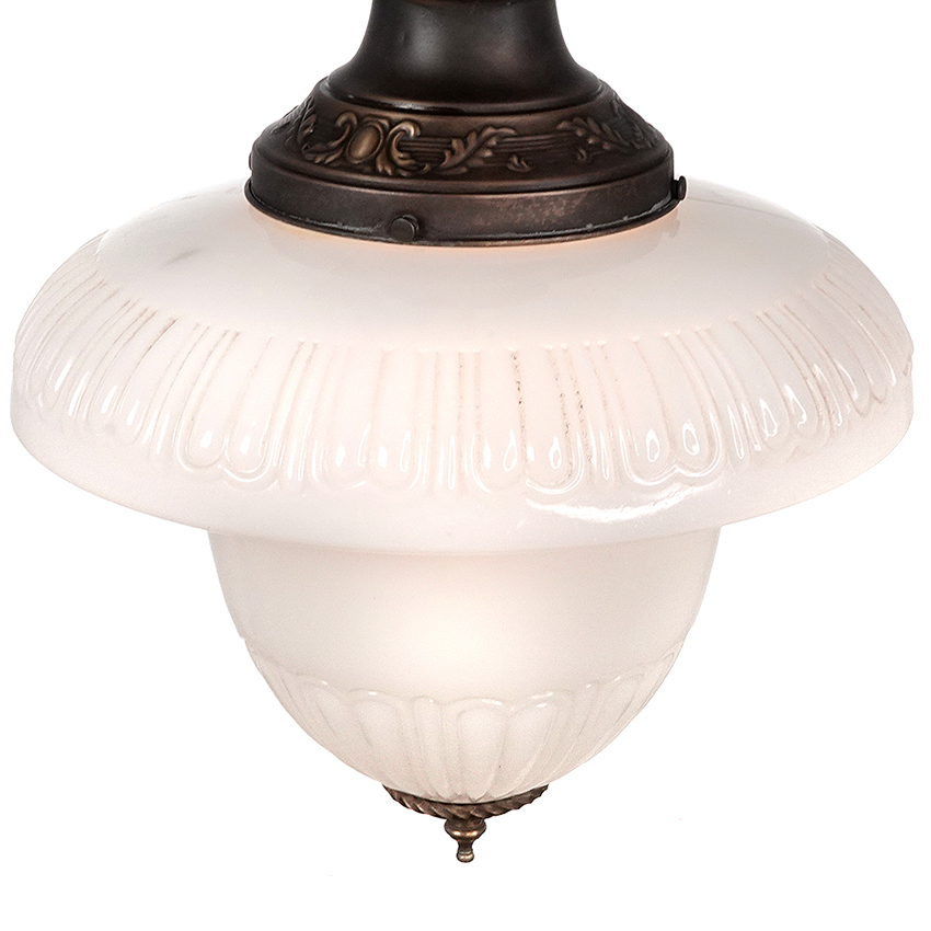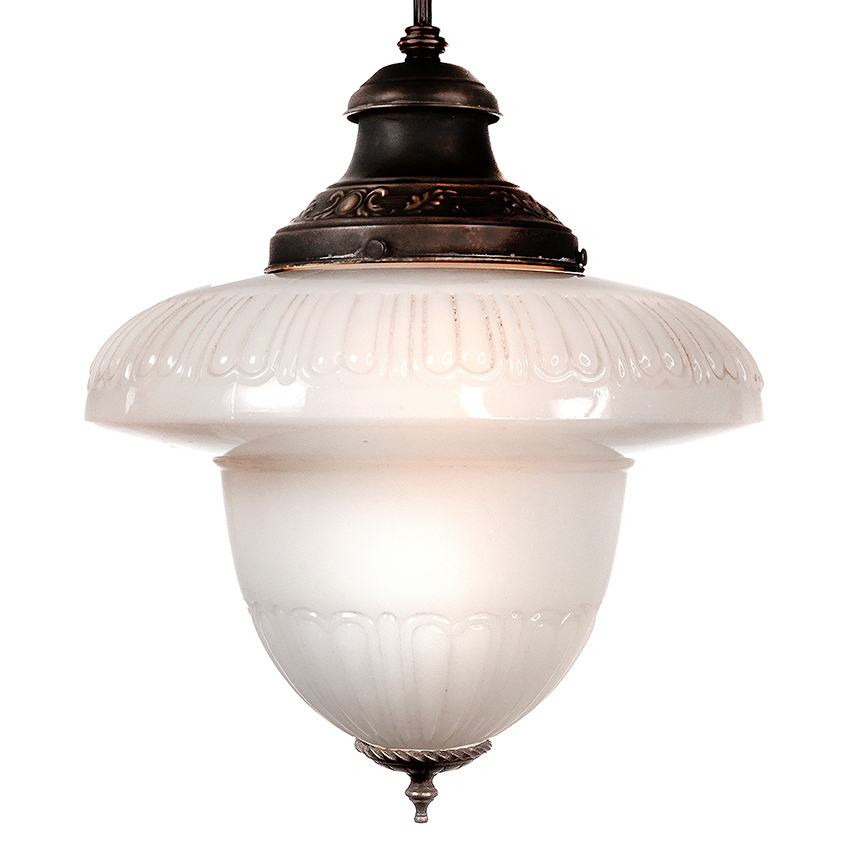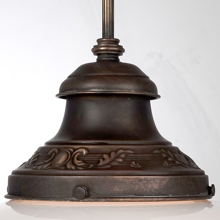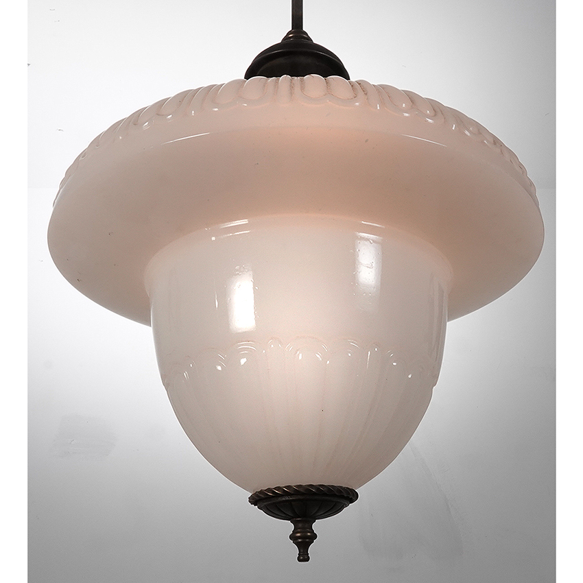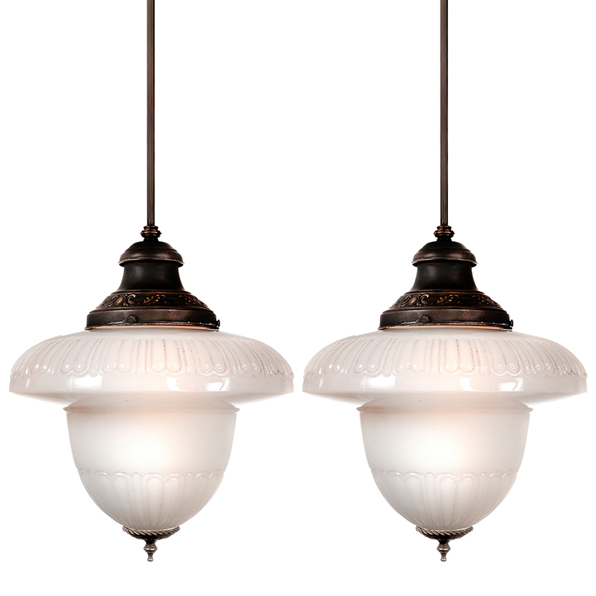 The shape is an exaggerated milk glass acorn with fluted areas top and bottom. The original shade holder has a stamped floral pattern. The shade is also finished with a nice decorative casting. I believe the twisted ring at the bottom is hand made. The pair have a rich and detailed classic look… 14″ diameter x 16″ plus pipe drop… $1500 for the pair