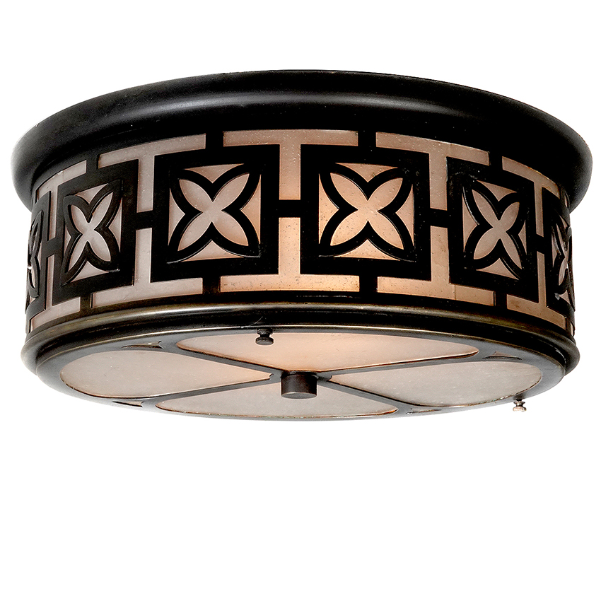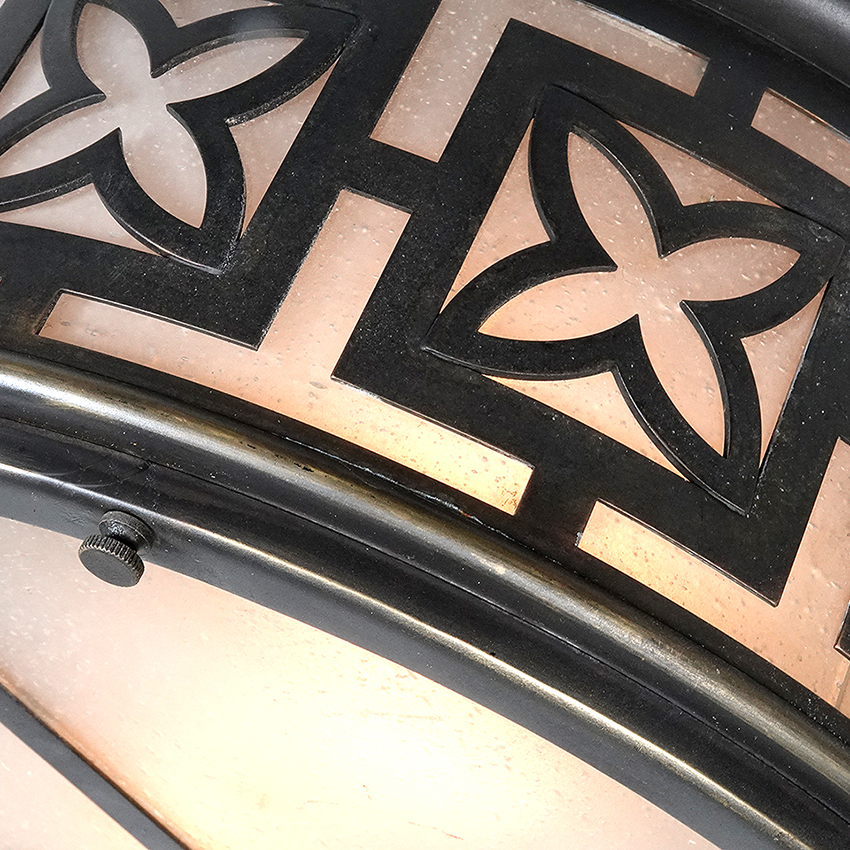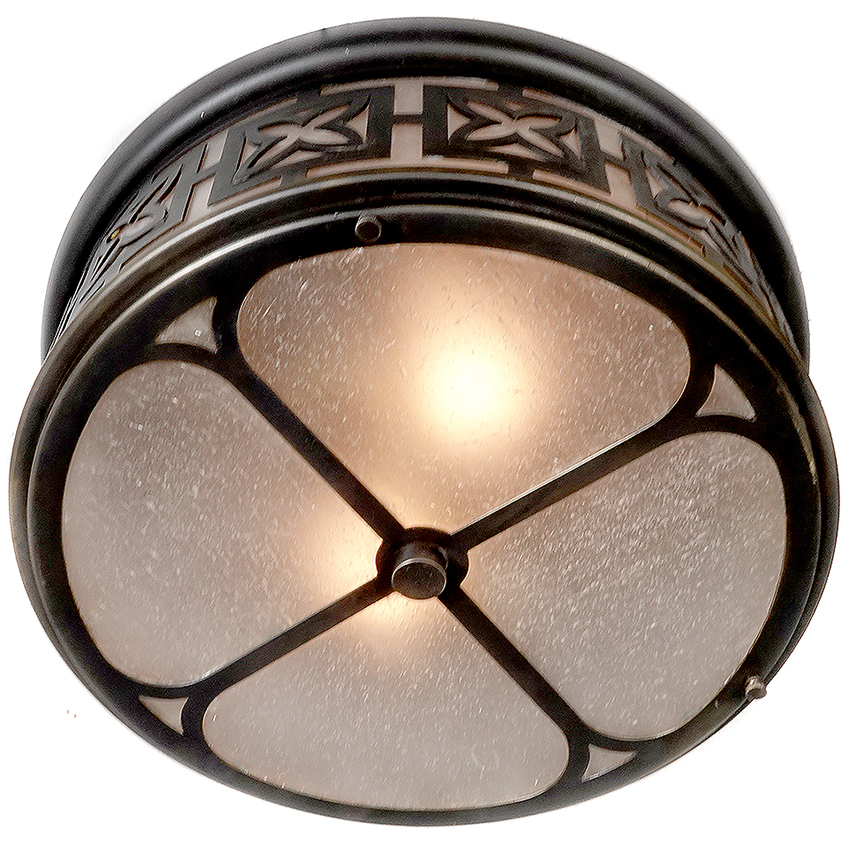 This is a hard to find and classic flush mounted lamp. The seeded and frosted glass is all original. The frame is a dark oil rubbed finish with a simple pattern dark light pattern over the glass. The look is very rich but simple and not over done. It is rewired using two E26 tubular bulbs… 16″ diameter x 1″… $750