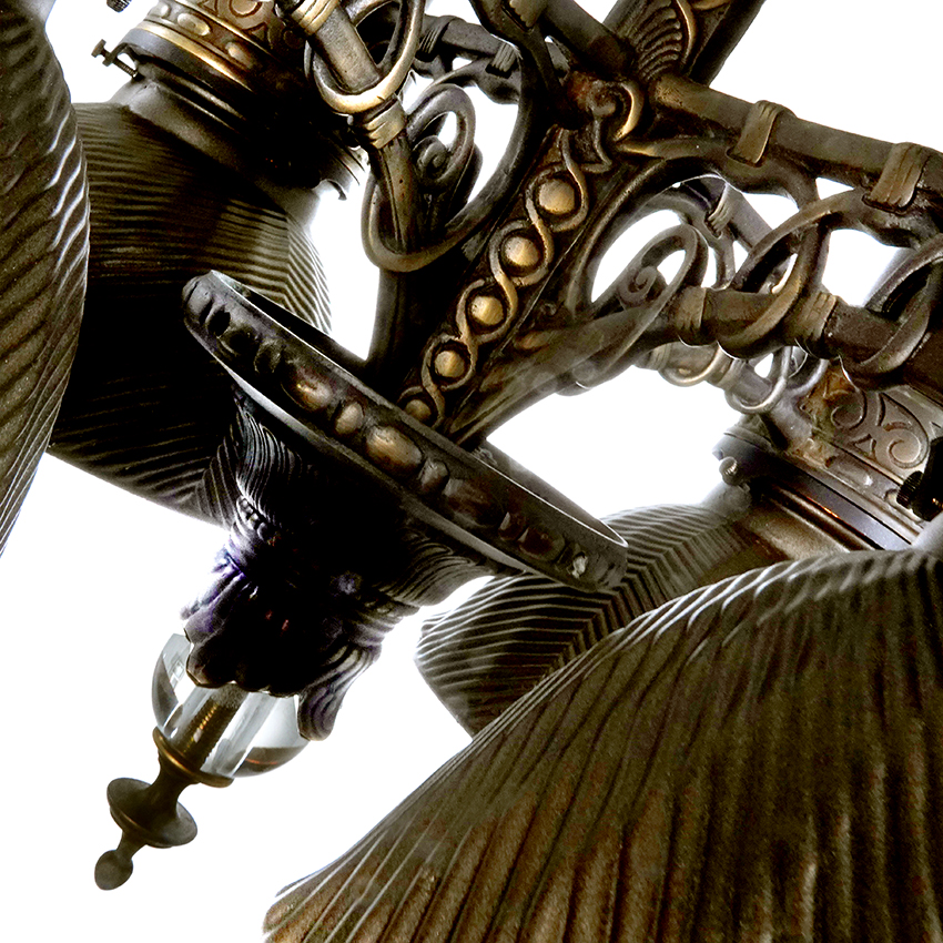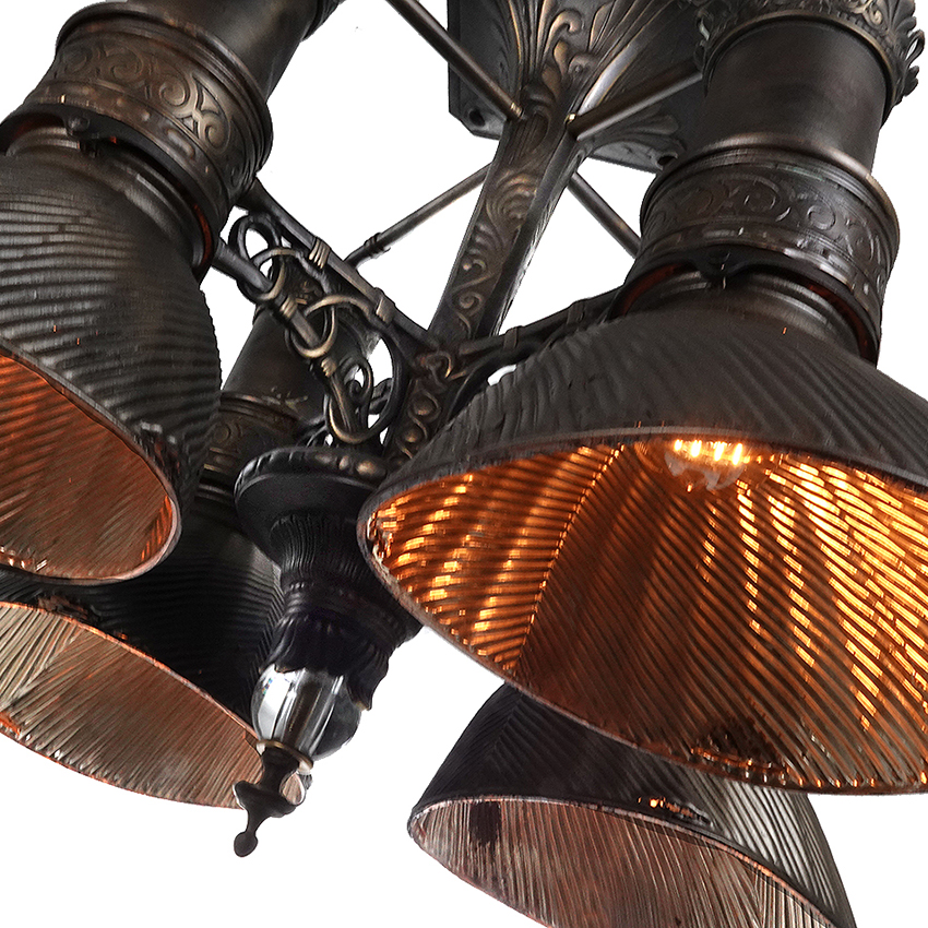 This is one of more important and interesting early train car lamps we have found. Few of these luxury class Victorian RR lamps still exist. Any remaining examples have found their way into museums some time ago. This was the type and quality of centre lighting used in private luxury Pullman cars from that era. They were also part of the elaborate personal train cars built for The Rockefeller’s and Vanderbilt’s. Here is a beautiful restored chandelier with 4 mercury (Union Ray) glass shades. The lamp also ends with a crystal ball finial. This lamp is unsigned but is most likely mid to late 1800s. This is a nice piece of railroad history and one we have not seen before… 24″ diameter x 22″…$4500