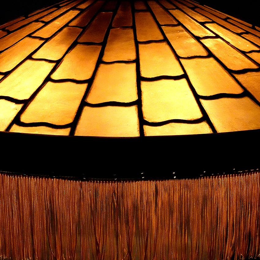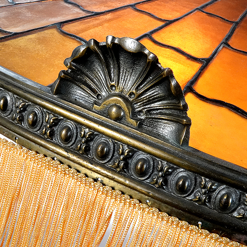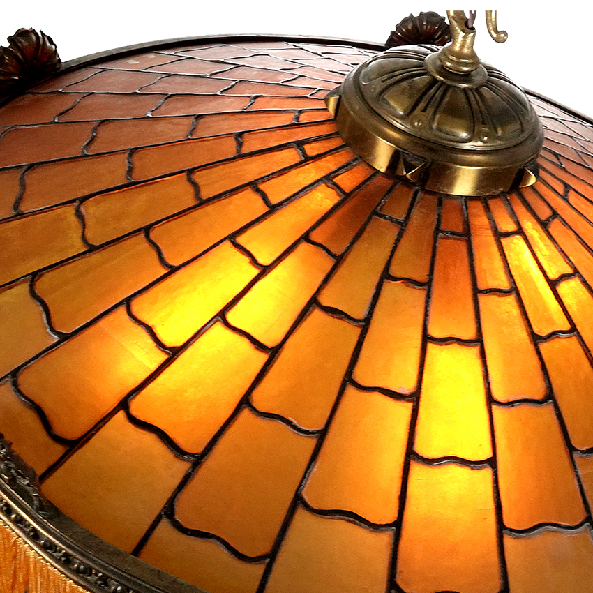 Right now this is one of me favorite lamps If I had the place for it I would take it home. The color, the style, the shape, the quality… It all works perfectly and creates something that is just right and tasteful. The amber stained glass has a decorative bronze frame featuring 5 shell medallions. The diameter is an impressive 27 inches and the hight is 14 inches plus five foot of original heavy bronze chain. I love the wavy cut glass pieces that have the look of a tiled roof. Not easy to do on so many pieces of glass. The original finish on the bronze and the fringe is still intact. It takes 4 E26 bulbs. This early lamp was well taken care of. It is unsigned but with this quality it could be an important maker…27″ diameter x 14″… $3200