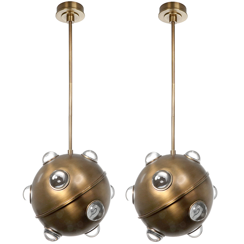 I love the unique look of this lamp. They do make a strong design statement all the way down to the ceiling canopy. I would not use them to light up a room or over a work space. They are perfect mood or ambient lighting. Its a matching pair with 15 inch diameters. The overall drop length as pictures is 43 inches. The down rod is screwed together in 2 sections so you have options to change the hight. They are UL Listed… $1700 for the pair