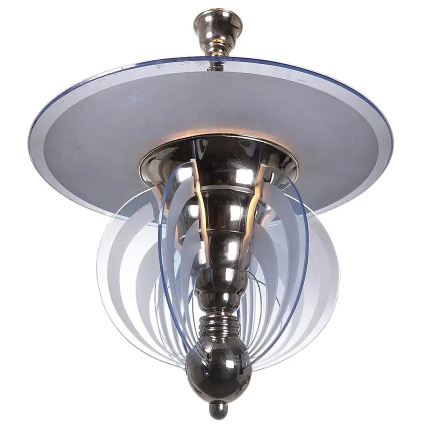 This striking modernist French Art Deco chandelier is attributed to Maison Petitot in Paris circa 1920. This amazing piece features a dramatic chromed metal frame and six vertical glass plaques plus a central glass 24 inch disk using frosted and clear patterns. Each panel has a frosted glass pattern etched into it creating an interesting layered look The glass has a very slight blue cast to it and is edge lit by 4 inner bulbs. This sigh style deco lamp makes a dramatic statement… 24″x24″… $4200
