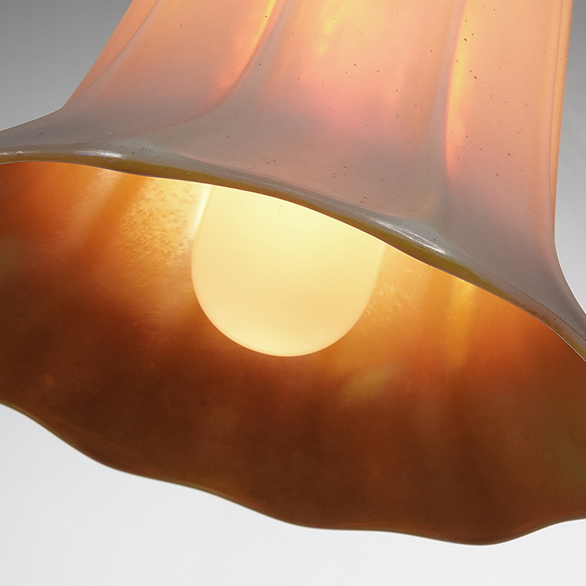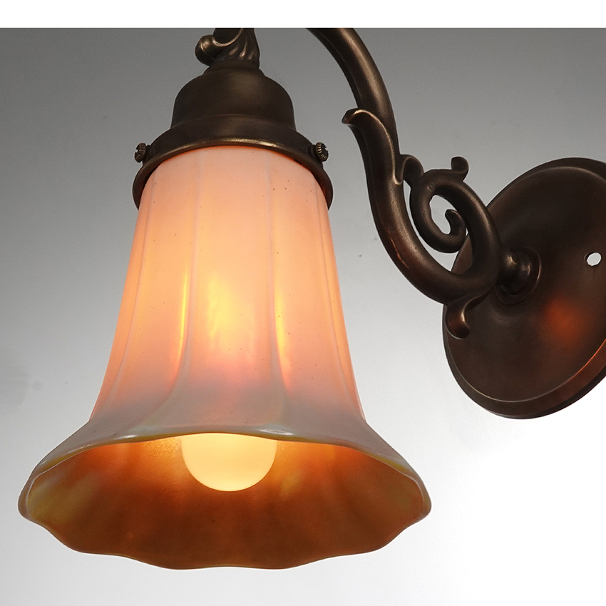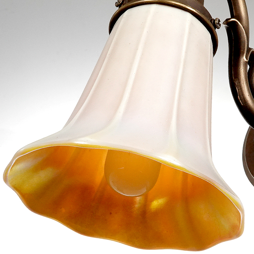 The shades are unsigned but I think is Quezal. The shade is delicate and beautiful. The outside is a creamy off white with a gold iridescent Aurene interior. The elegant shape is a trumpet flower and the fixture is a dark brass in a floral pattern. Sold and priced as a matching pair… 9.5×9.5×5″… $950 for the pair