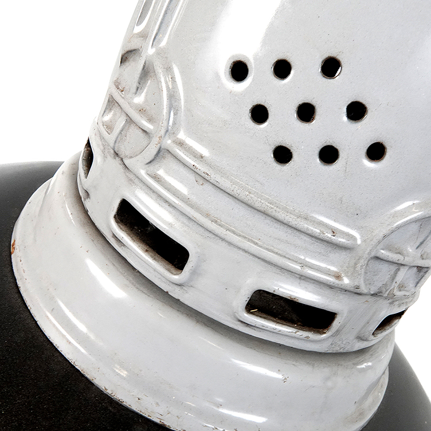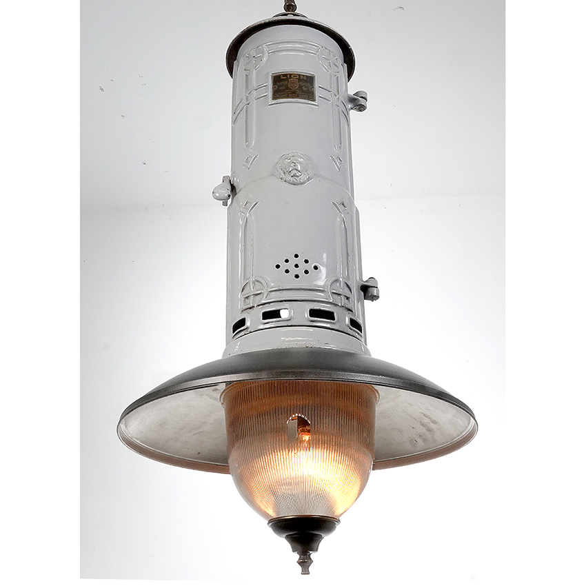 Sometimes hunting the flea markets we find some amazing things. This time it was a 1906 Lion water heater. The finish is a beautiful warm gray baked-on porcelain over cast iron. With an early prismatic Holophane glass dome and a darkened 18 inch diameter shade added we end up with this one of a kind lantern. The original designs on the lamp body include a lions head and decorative arts and crafts decorative detail. The lamp is 36 inches tall plus an additional drop that can be chain or pipe… $1400