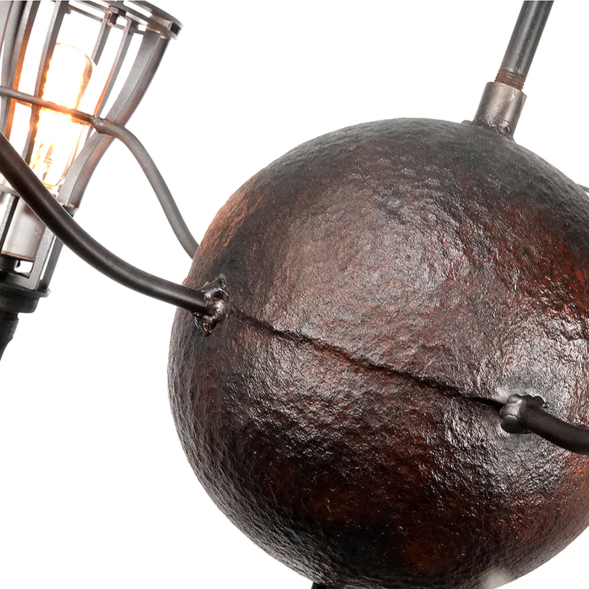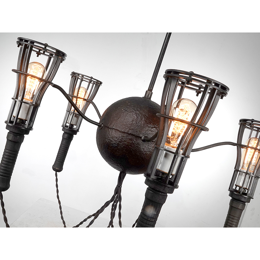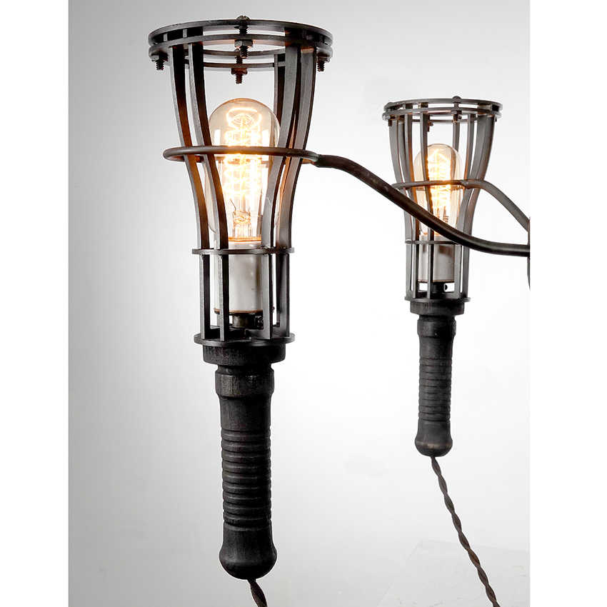I think this is one of the most interesting and elegant industrial lamp confections I have offered. The chandelier centers with a very old 8 inch pitted steel ball with curved arms. At the end of every arm is a ring. Each ring cradles a 12 inch wood handled cage trouble lamp. It has a 20 inch diameter and a 36 in drop that can be finished to your drop length. You won’t see another… $2600