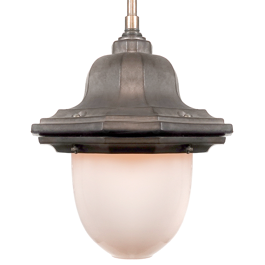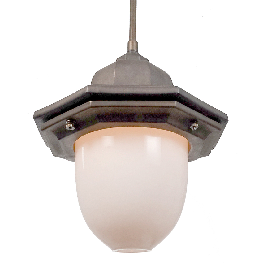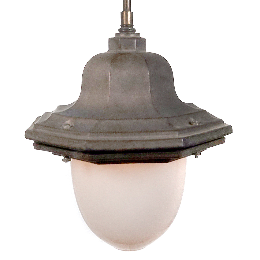 We have only one these lamps and found this on at the Paris Flea Market. The 2 part body is terracotta and has a mat warm gray glazed finish. The milk glass globe is a deep dome. The fixture measures 12 inches in diameter by about 14 inches tall plus a pipe drop you spec… $625