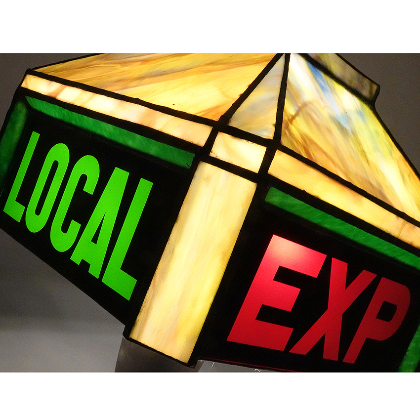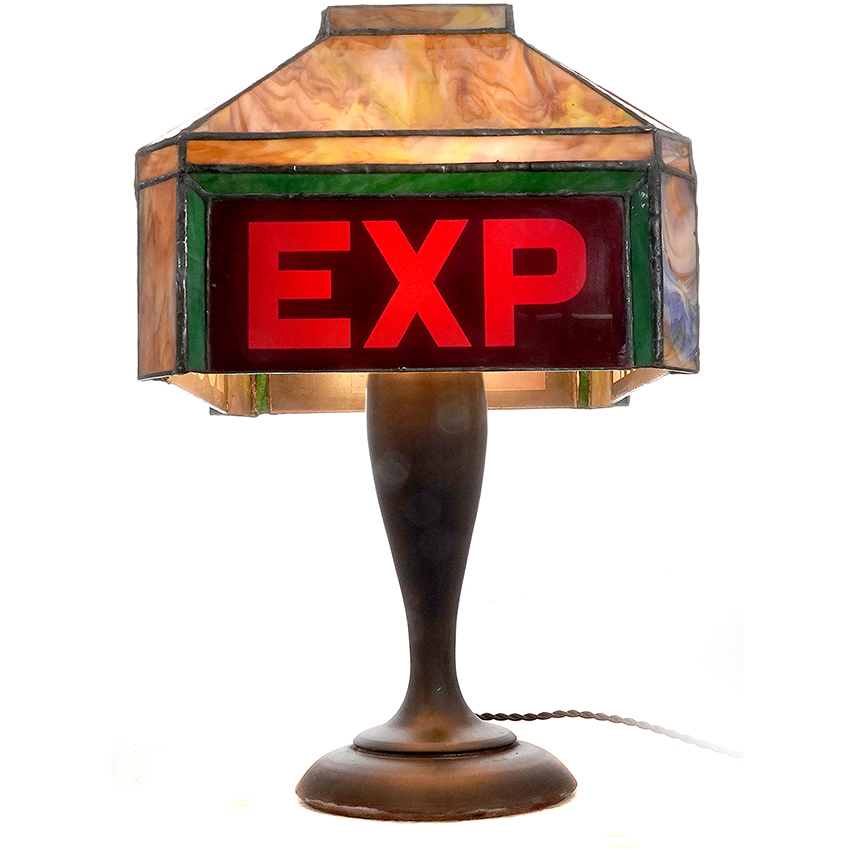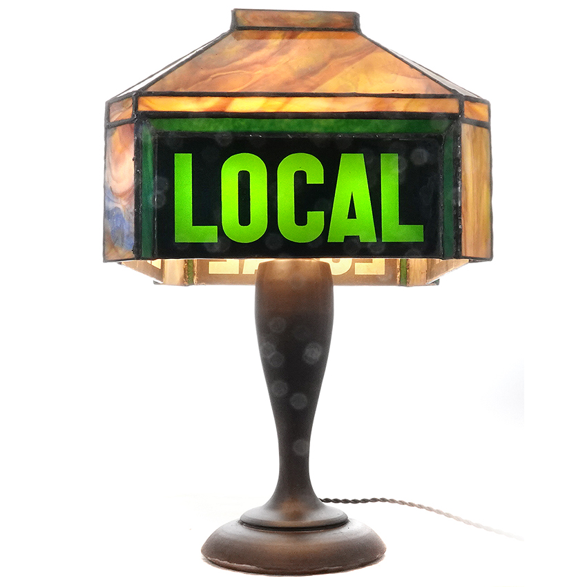 This stained glass table lamp is really unique. This will be something of interest to railroad enthusiasts. The 4 sided lamp reads EXP and LOCAL in red and green letters. On its own the lamp is striking and uses beautiful multi colored glass but the interesting story behind it adds to its interest. All the glass is in perfect condition… 18.5×23″… $925